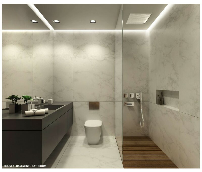 Τα πατώματα είναι όλα επιστρωμένα με πλακάκια μεγάλων διαστάσεων ή με ξύλο όπως προβλέπεται στο αρχιτεκτονικό σχέδιο. Τα μπάνια είναι επενδυμένα με κεραμικά πλακάκια επίσης μεγάλων διαστάσεων, υπάρχει ευρύχωρη καμπίνα ντους, έπιπλο μπάνιου, και οι βρύσες είναι εντοιχιζόμενες.