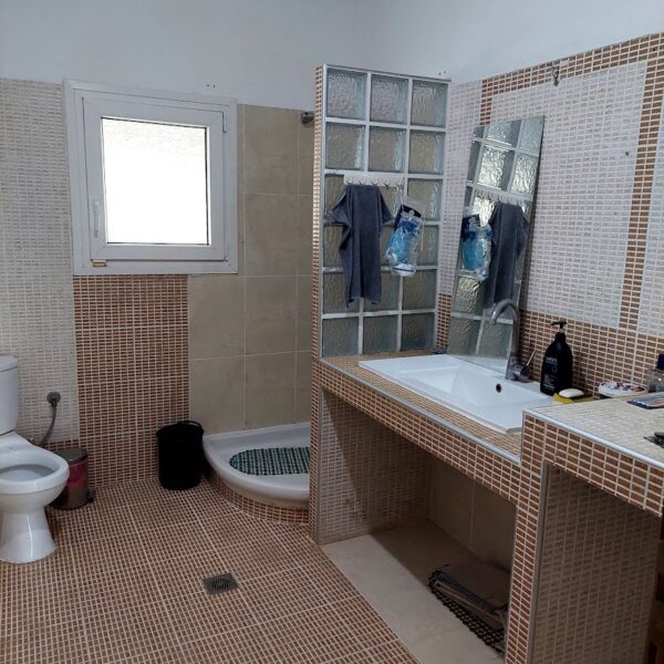 Das Haus befindet sich auf einem 3500qm großen Grundstück mit einem herrlichen Blick auf das Meer und den Berg Olympus. Auf dem Grundstück gibt es 18 Olivenbäume und verschiedene Obstbäume. Das Gebäude ist 358qm groß, wovon 180qm auf das Haupthaus entfallen und der Rest auf die Nebenräume. Es wurde 2009 nach den besten seismologischen Standards und mit hochwertigen Materialien für den Eigengebrauch gebaut. Es hat eine vollständige Außenisolierung für Kälte und Wärme.