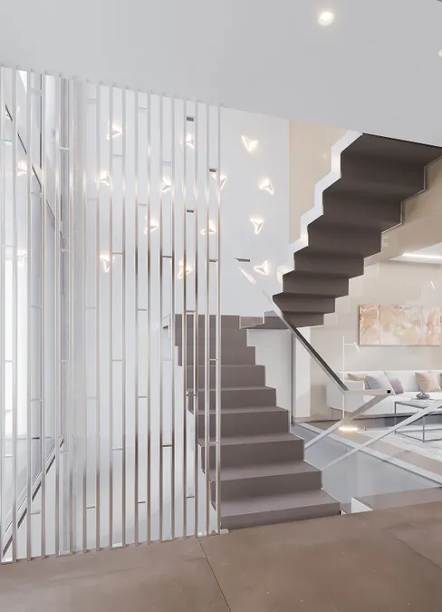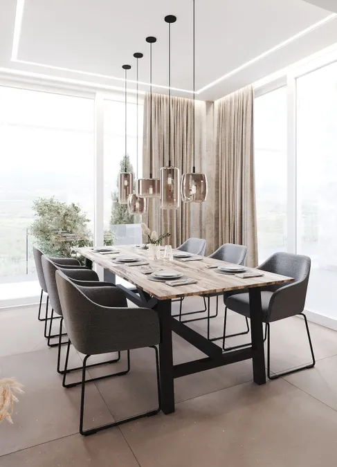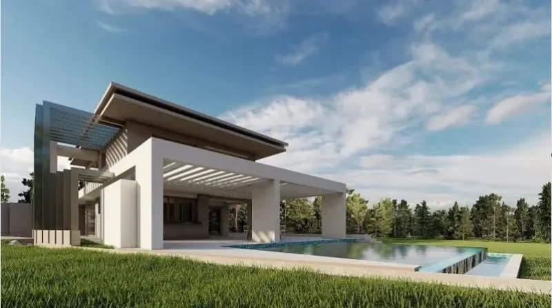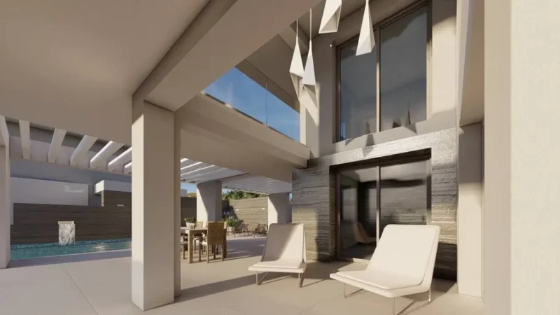 Die Villa hat eine moderne, minimalistische Ästhetik und ist im mediterranen Stil mit modernen technischen Lösungen gebaut. Einige der Gebäude sind mit Naturstein, Travertin, verziert. Die Zusammensetzung aus eloxiertem Metall ist eine architektonische Lösung, die den modernen Stil gut zur Geltung bringt.