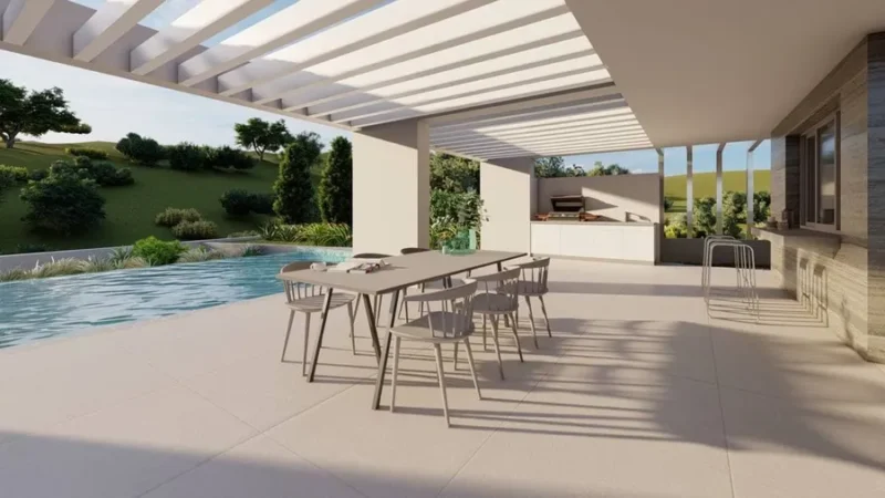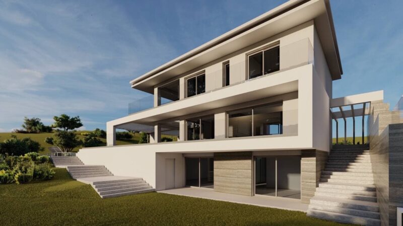 Die Küche ist nach allen Regeln der Ergonomie gestaltet. Es ist mit der besten Technik ausgestattet und bietet viel Platz. Nachdem Sie Ihr Lieblingsgericht zubereitet haben, können Sie auf der Sommerterrasse frühstücken und dabei den Blick auf das Meer und die Berge genießen. Der Innenhof verfügt über einen zusätzlichen Grill- und Solariumbereich, und dank der verglasten Fenster im größten Teil des ersten Stocks ist die Aussicht vom Haus aus deutlich besser. Der 45 m2 große Infinity-Pool vermittelt den Eindruck, am Rande einer Klippe zu stehen, und die Wasseroberfläche ist endlos. Dank der rutschfesten Oberfläche aus Porzellangranit kann man sicher um den Pool herumgehen.
