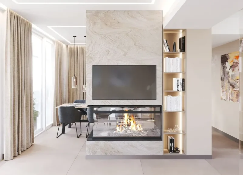 Die Panoramafenster im Wohnzimmer bieten einen Blick auf die Ägäische Bucht und Chaniotis. In der Mitte befindet sich ein doppelseitiger Kamin, der eine Atmosphäre der Gemütlichkeit und Wärme schafft und an den seltenen kühlen Tagen gut wärmt.