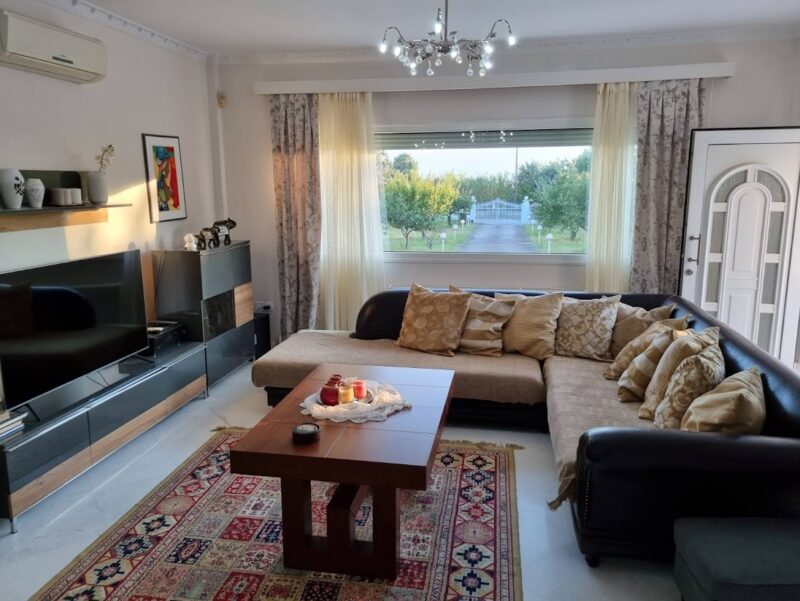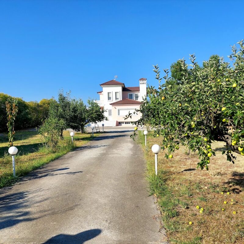 Die Villa mit ihrer eleganten architektonischen Gestaltung liegt an der Hauptstraße von Epanomi – Nea Iraklia auf einem 5000 qm großen Grundstück mit vielen Obstbäumen, wie Birnen, Apfelbäumen, Granatäpfeln, Walnussbäumen, Moschusbäumen, Lotusbäumen sowie Olivenbäumen. Im Außenbereich gibt es eine große, voll ausgestattete Küche und eine überdachte Veranda mit einem Grill für unvergessliche Bankette im Freien. Die überdachte Garage bietet Platz für zwei Autos, weitere können auf der Freifläche abgestellt werden. Der Gastank am Rande des Grundstücks versorgt die Heizkörper, für eine warme Atmosphäre in den kalten Monaten mit der sparsamsten Methode. Es gibt auch einen großen Außenlagerraum mit allen notwendigen Werkzeugen für die Immobilie. Das Schwimmbad war nicht der Wunsch der Eigentümer und deshalb gibt es es es auch nicht. Aber der Standort selbst zeigt, wo er gebaut werden sollte, wenn die neuen Eigentümer dies wünschen. Die Außenbeleuchtung unterstreicht den Charme der natürlichen Umgebung an den Nachmittagen. Die gut gepflegten Zäune und die elektrisch betriebene zentrale Eingangstür tragen zur Sicherheit und Privatsphäre der Bewohner bei.