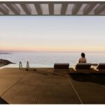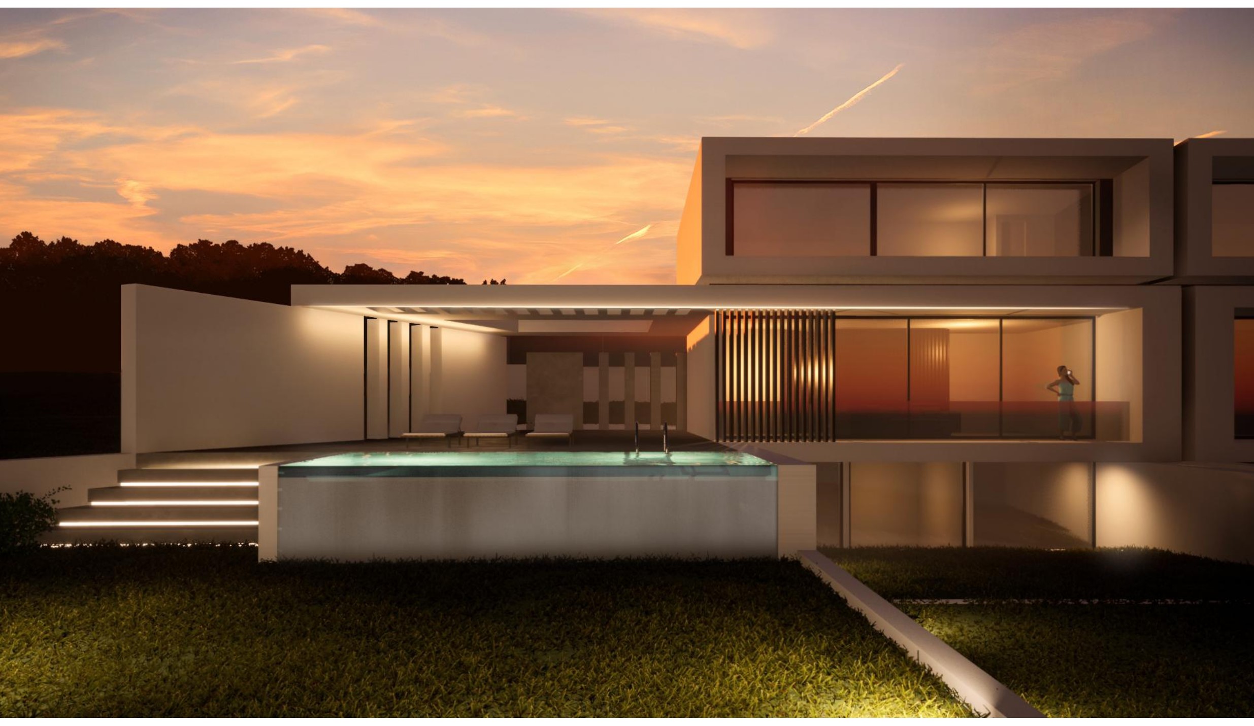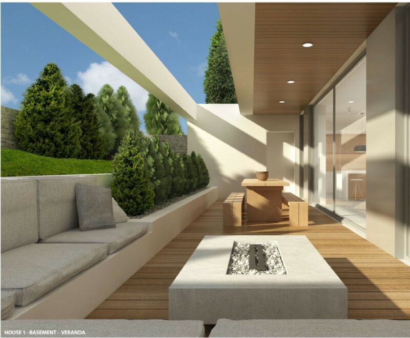 Outside the ground floor there is a 70 sq.m. terrace which is covered with a permanent pergola for sun protection and is designed to offer privacy. It is a relaxation area for the residents, where sun loungers and a sofa can be placed. The swimming pool with unobstructed sea views was also designed there.