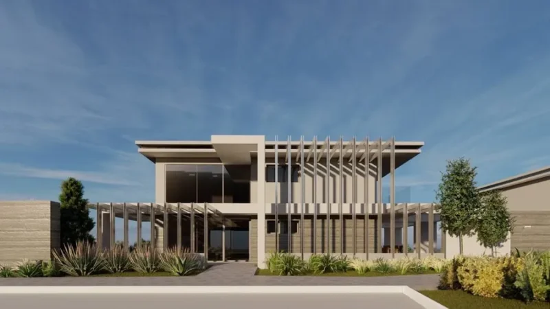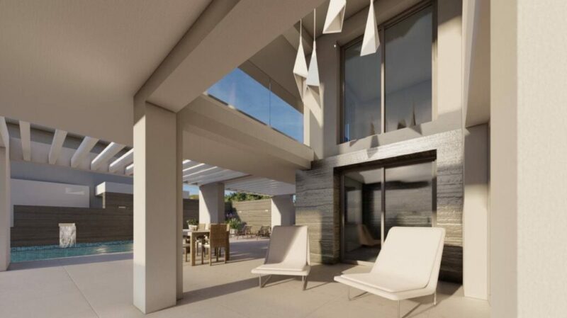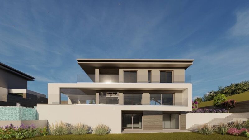 The villa has a modern minimalist aesthetic and is built in Mediterranean style with modern technical solutions. Some of the buildings are decorated with natural stone, travertine. The anodized metal composition is an architectural solution that accentuates the modern style well.