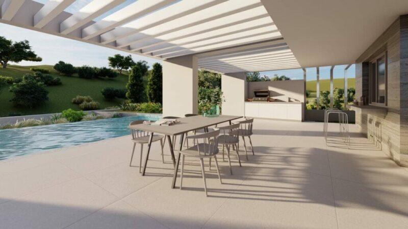 The kitchen is designed according to all the rules of ergonomics. It is equipped with the best technology and has plenty of space. After preparing your favorite dish, you can step out onto the summer patio and have breakfast while enjoying the view of the sea and the mountains. The patio has an additional barbecue and solarium area and thanks to the glazed windows on most of the first floor, the view from the house is greatly increased. The 45 m2 infinity pool gives the impression of being on the edge of a cliff and the water surface is endless. At the same time, thanks to the non-slip porcelain granite surface, it will be safe to walk around the pool.